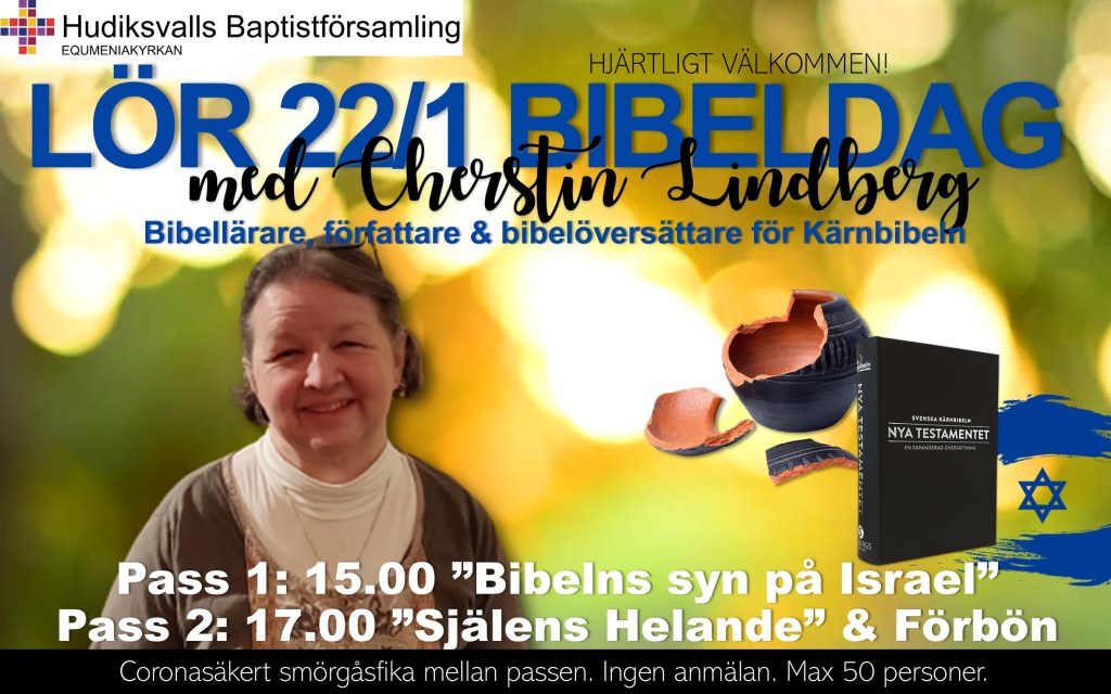 Välkommen till en dag vid Guds Ord! Nu på lördag, den 22 januari, får vi besök av Cherstin Lindberg, bibellärare, författare och bibelöversättare. Cherstin talar hebreiska och är delaktig i översättningen av Kärnbibeln (www.karnbibeln.se), vilken är en pågående bibelöversättning med många intressanta förklaringar och kommentarer insprängda i bibeltexten. Cherstin har en stor kunskapskälla att plocka ur och dagen kommer att delas upp i två delar, med coronasäker servering av smörgåsfika mellan passen.