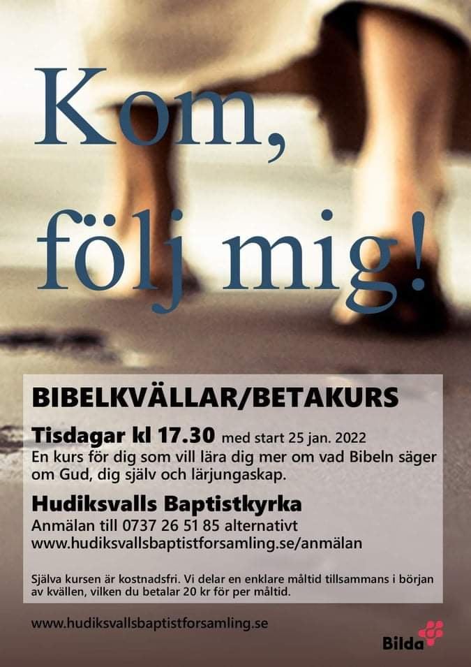 Idag börjar vi med vårens Bibelkvällar/Betakurs, som vi kommer att ha på tisdagar kl 17.30! Kvällarna börjar med en stunds måltidsgemenskap, därefter bibelstudium och samtal. Kvällen avslutas runt kl 19.30. Kursen hålls i Baptistkyrkans församlingssal och är kostnadsfri. Endast en mindre avgift för maten (20 kr per kväll).