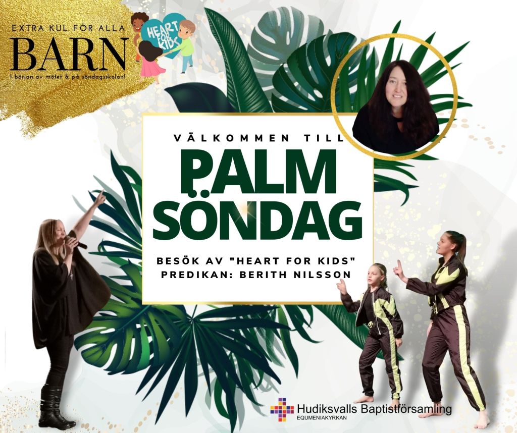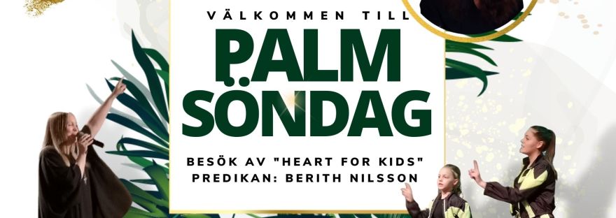 På palmsöndagen blir det lite extra inslag för och med barn och ungdomarna. Vi får även besök av ”Heart for Kids”, som är med som en del av gudstjänsten, innan de går ut med barnen till Söndagsskolan. Predikar gör Berith Nilsson.
