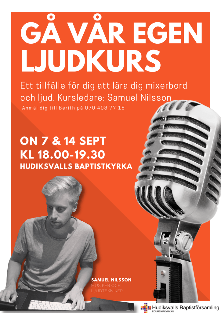 Vi har ett stort behov av ljudkillar och ljudtjejer till våra gudstjänster och samlingar. Tycker du att det skulle vara roligt att lära sig mixerbord och ljud, så har du ett ypperligt tillfälle nu! Samuel Nilsson, ljudkille och musiker, kommer att två onsdagar i rad hålla en ljudkurs i två delar. Hör av dig till Berith (tele, se bild), om du är intresserad!