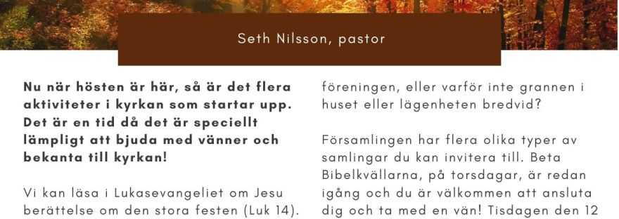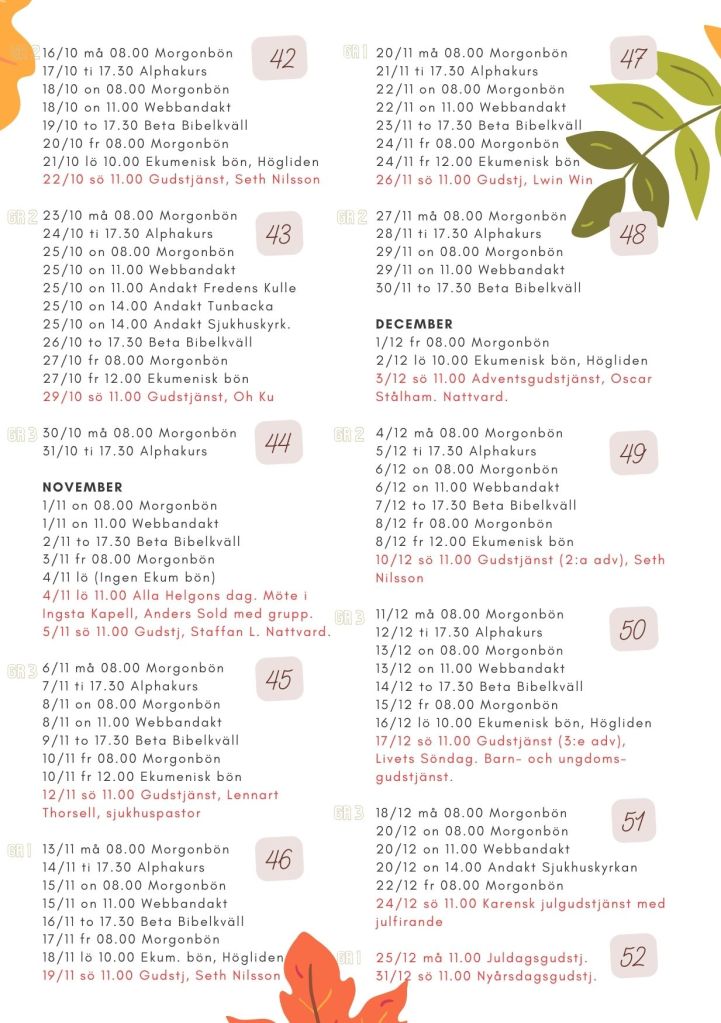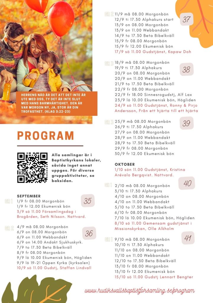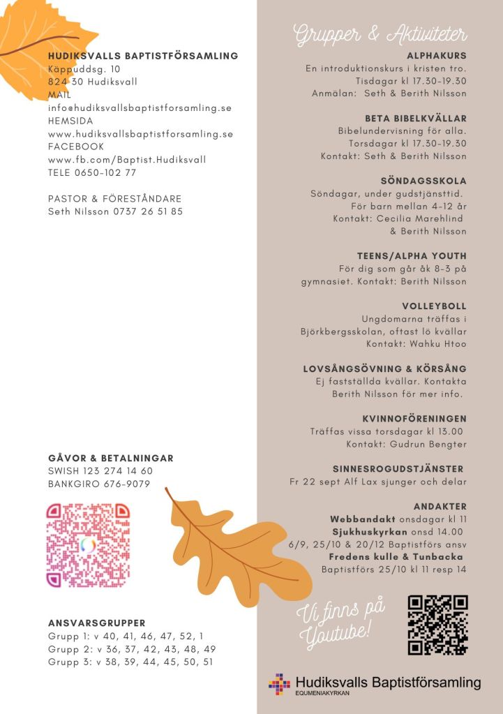 Nu hittar du höstens program dels på program-sidan, samt här nedan i bildform. Det kommer även att finnas i kyrkan att hämta i papperstryck, (där även all kontaktinfo på baksidan finns inskriven). Vi önskar dig en välsignad höst. Välkommen till våra gudstjänster och samlingar!