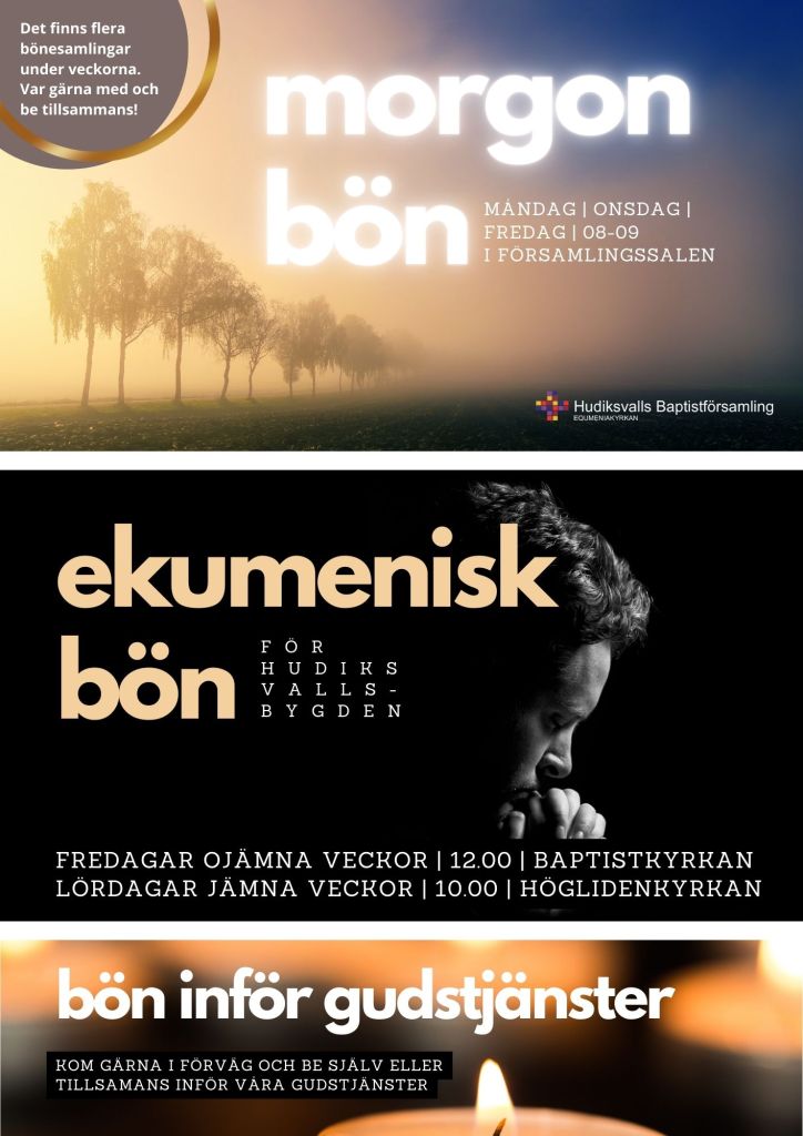- Ekumenisk bön, ojämna fredagar kl 12 i Baptistkyrkan, jämna lördagar kl 10 i Högliden.