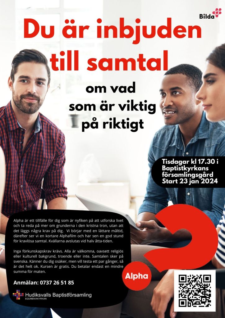 - Alphakurs tisdagar kl 17.30-19.30 Anmälan via QR-kod på bilden nedan eller via 0737 26 51 85 (start 23/1)