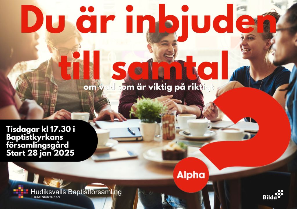 Alpha är ett tillfälle för dig som är nyfiken på att utforska livet och ta reda på mer om grunderna i den kristna tron, utan att det läggs några krav på dig. Vi börjar med en lättare måltid, därefter ser vi en kortare Alphafilm och har sen en god stund för kravlösa samtal. Kvällarna avslutas vid halv åtta-tiden.