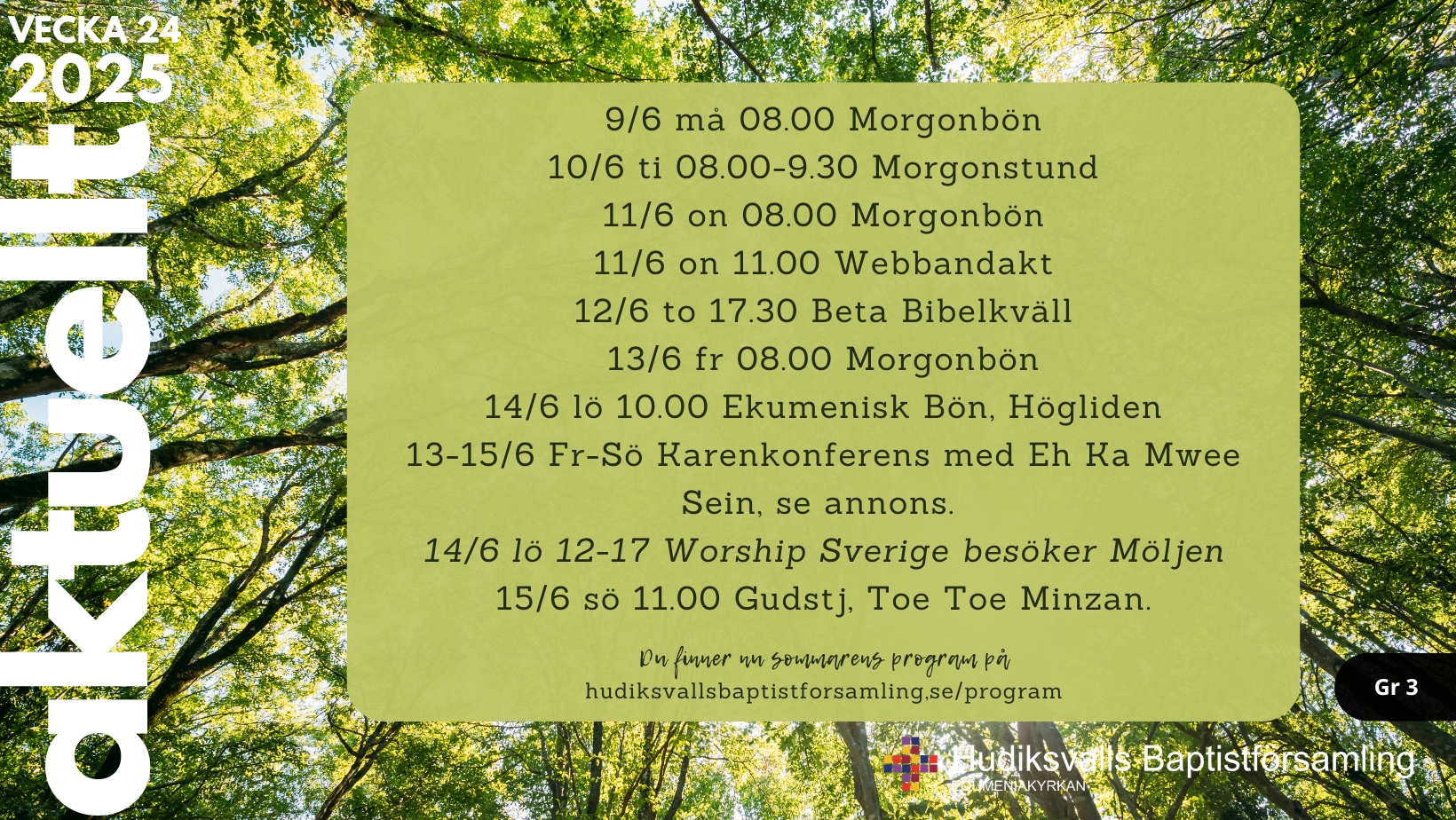 Som vanligt har vi morgonbön, må, on, fr 08, morgonstund på tisdag morgon, samt ekumenisk bön på Högliden lö kl 10. Beta Bibelkvällarna går ner för landning, innan sommaruppehållet som närmar sig och det är den sista ”vanliga” träffen, innan sommar/avslutnings-festen nästa tisdag (17 juni). Webbandakt på onsdag. För exakt info, se bilder.