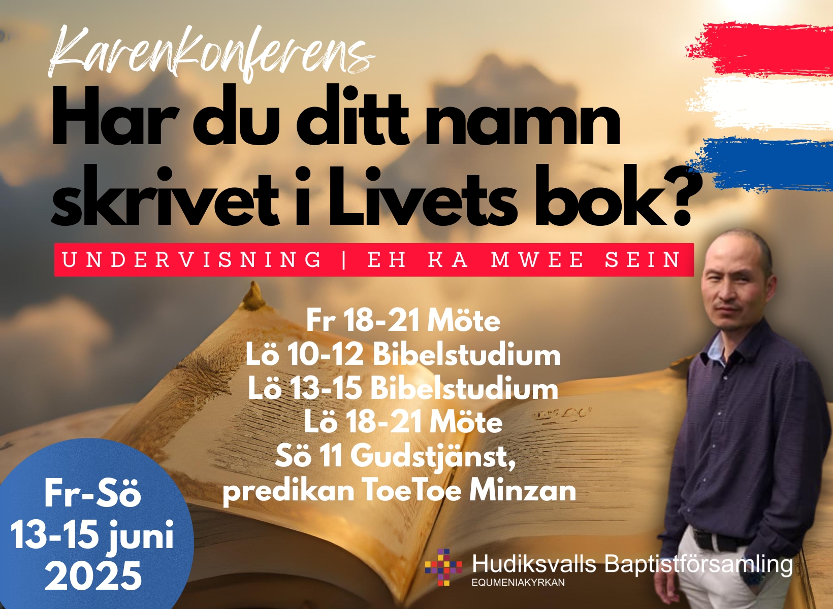 Under helgen är Eh Ka Mwee Sein, karenpastor boende i Norge, inbjuden för till en karenkonferens. Samlingarna hålls på karen, men kan tolkas till svenska, och är öppna för alla.