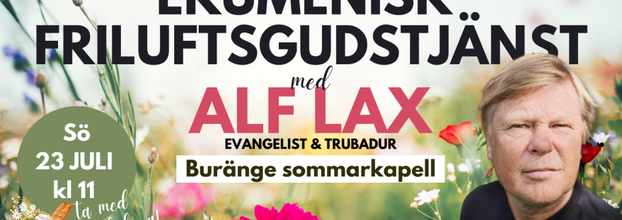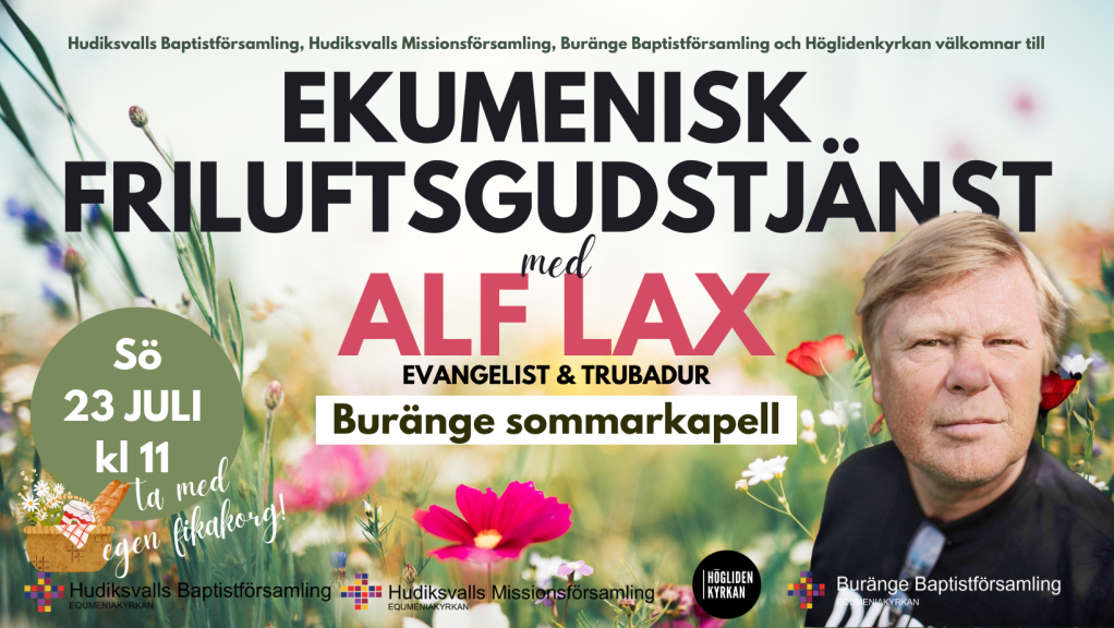 Den 23 juli får då besök av evangelisten och trubaduren Alf Lax i en gemensam friluftsgudstjänst med Missionskyrkan, Buränge Baptistförsamling och Höglidenkyrkan, vid Buränge Kapell, utanför Iggesund (adresslänk). Vi tror på en härlig dag med en välsignad gudstjänst och mycket gemenskap! Välkommen! Glöm inte fikakorgen!